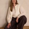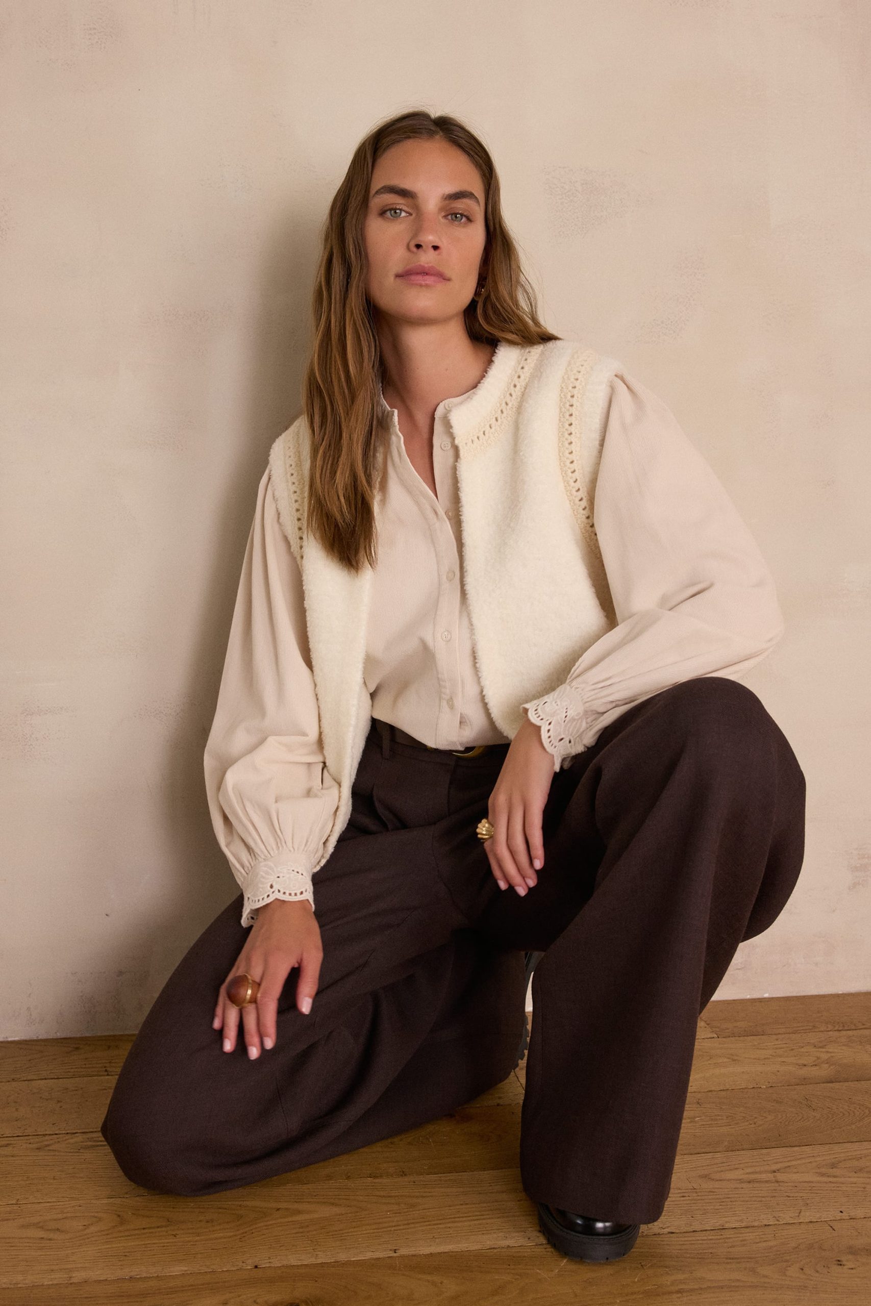 Wear this ecru cardigan with a tone-on-tone blouse and brown suit trousers for a soft and refined look. Add leather loafers or boots for a touch of timeless elegance.