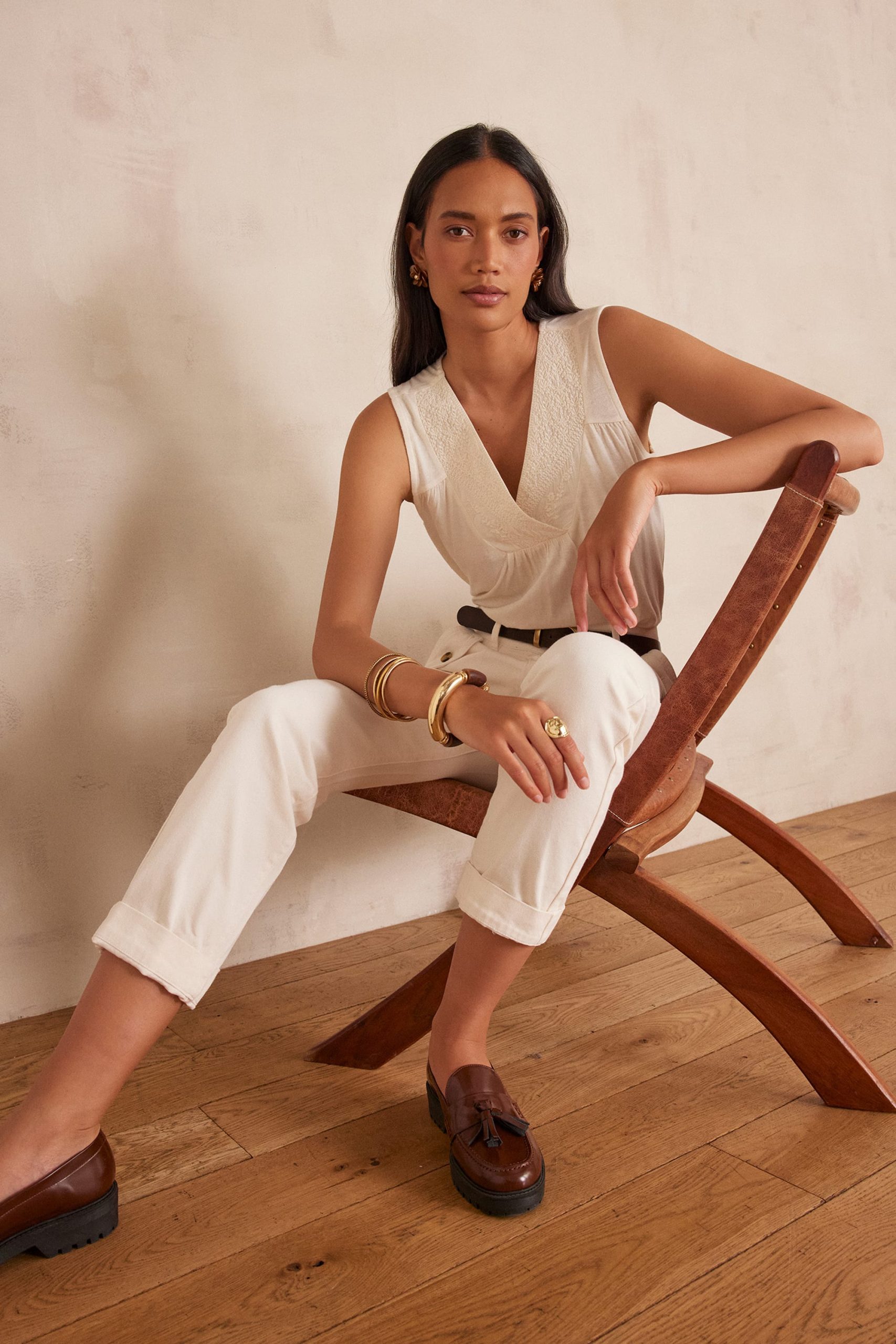 Tia is 1m78 tall and wears a size 34. With the FELIX tanktop, the model wears MATEO trousers, ANNETTE parka and VALENTIN loafers.