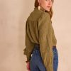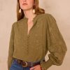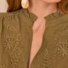 Dare to contrast by pairing this khaki embroidered blouse with off-white or beige trousers for a luminous look, or go for a bohemian vibe with a long printed skirt in warm tones.