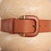 This belt is appealing with its intense camel colour and square buckle that gives it character.
