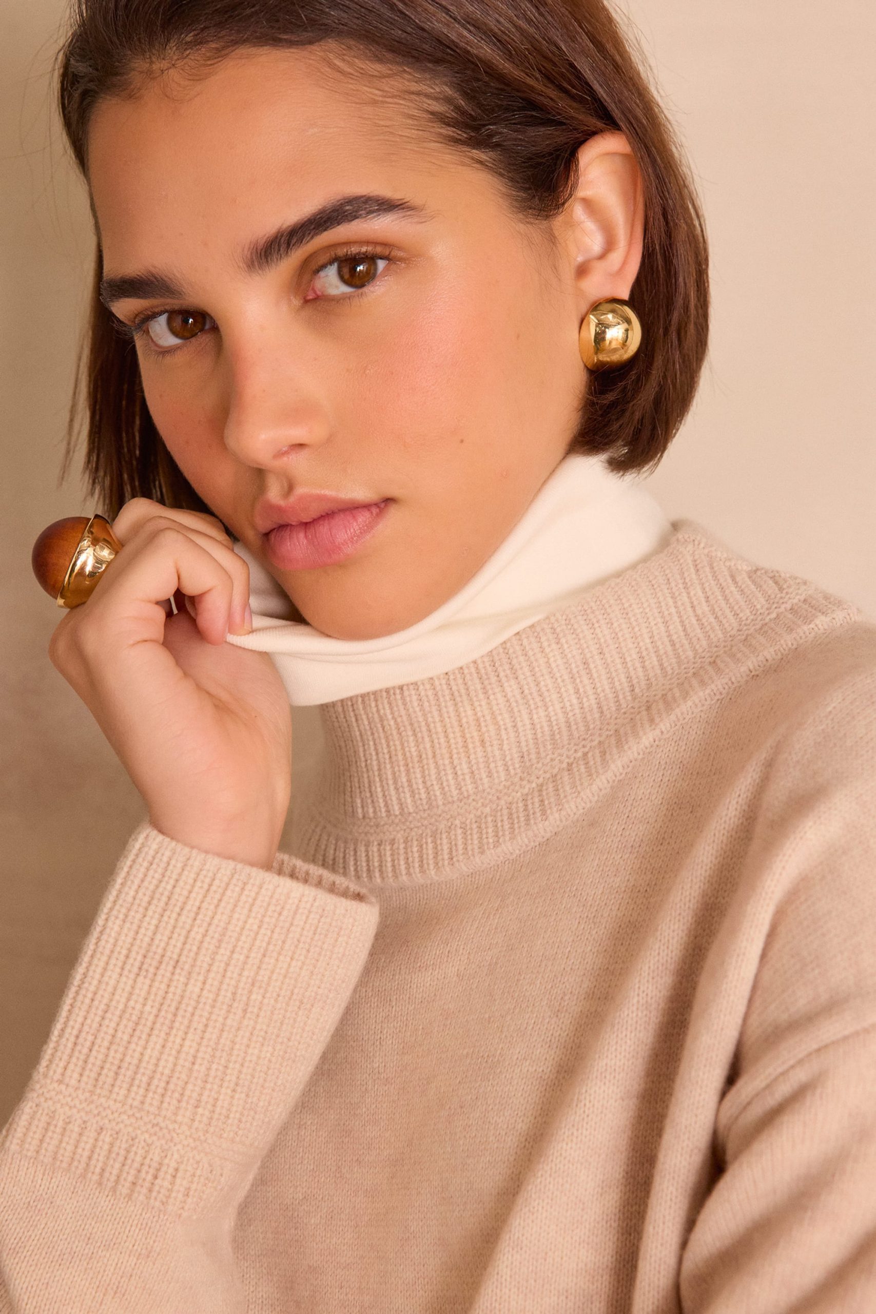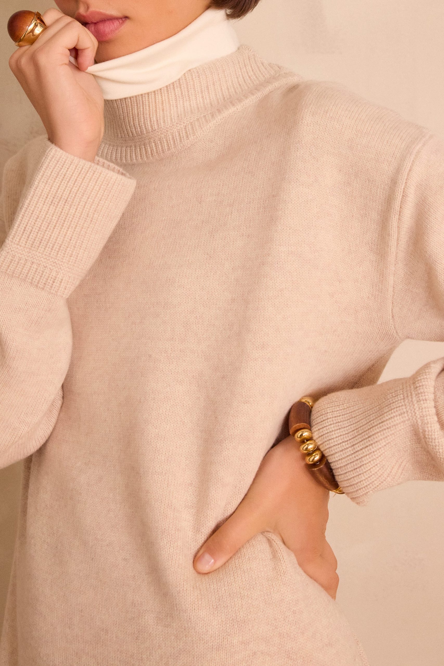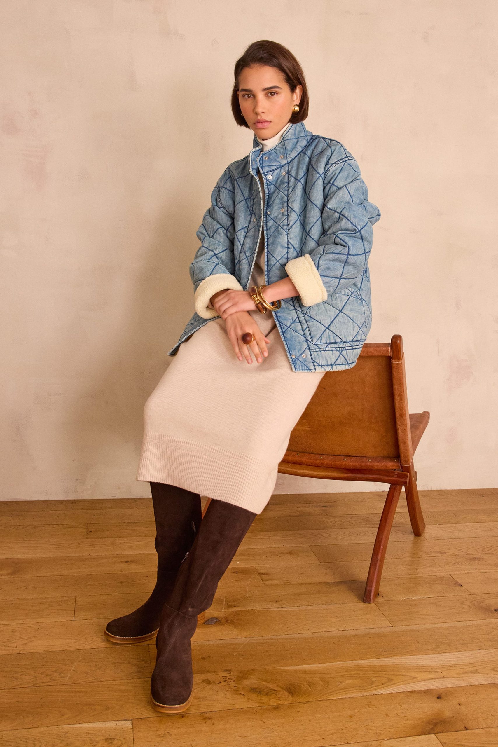 Structure the jumper dress with a thin leather belt to accentuate the waist and feminise the silhouette. Add a long camel or ecru coat to play with soft tones, and opt for riding boots or suede cowboy boots to reinforce the casual-chic spirit.